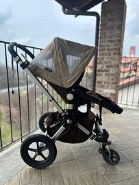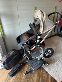 Bugaboo carrozzina e passeggino, con borsa, porta biberon e pappa termico, due cappottine (arancio e sabbia estiva), parapioggia e sacco a pelo grigio. Più accessorio pedana con seduta per fratello/sorella più grande