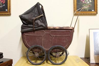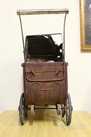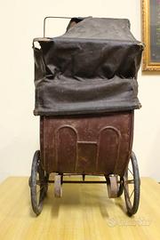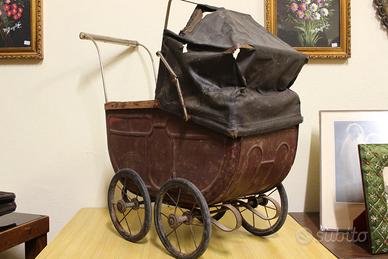 Carrozzina giocattolo per bambole, anni '50/'60, in latta, comprendente copertina in pizzo, ricamata.