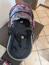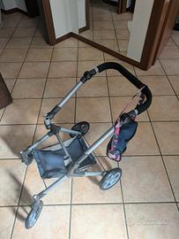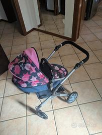 Carrozzina per bambole, con navetta staccabile, si può girare sia fronte strada che fronte mamma, si trasforma in passeggino, completa di copri gambe, rete sotto la navetta e borsa portatutto coordinata. Consegna a mano.