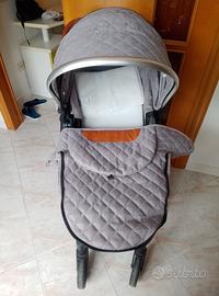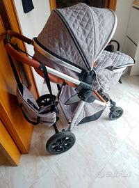 Carrozzina Moni modello Alma. PREZZO IN ACCORDO Con passeggino e ovetto. Composta da materassino più cuscino e borsa portaoggetti. In tessuto grigio con inserti in pelle marrone. Van portaoggetti inferiore. Ruote alte con ammortizzatori. Semplice nel monto smonto. In ottimo stato, da lavare.