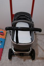 Carrozzina trasformabile in passeggino. È possibile orientare il neonato verso la strada o verso il conducente. Dotato di parapioggia, zanzariera, borsa per passeggino, cintura di sicurezza a 5 punti e doppia sospensione, per una maggiore stabilità su tutte le strade. Materassino acquistato separatamente in omaggio. Ottime condizioni, usato 12 mesi