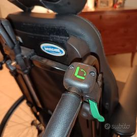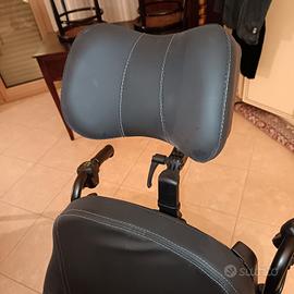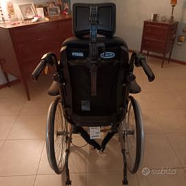 Carrozzina posturale basculante praticamente nuova dotata di pedane estraibili e regolabili, con polpaccere imbottite; poggiatesta imbottito e regolabile; schienale reclinabile; seduta basculante anti decubito; braccioli imbottiti; cintura addominale contenitiva.