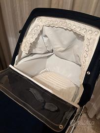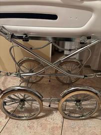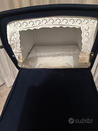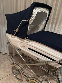 Vendo carrozzina vintage marca Perry Pram anni 70, tenuta in ottime condizioni: •Telaio cromato ben lucido •Ruote grandi con parafanghi integri •Culla sagomata bianca senza graffi evidenti •Cappottina blu scuro con merletto e finestrella trasparente intatti •Tessuti puliti e ben tesi È un modello “coach-built” “Materassino e cuscino originali dell’epoca, in buone condizioni. ( questi ultimi sono pero articoli vintage da collezione, non destinati all’uso con neonati) Ritiro a mano Pescara colli