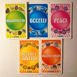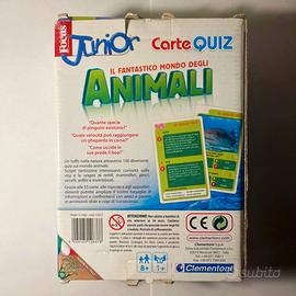 Vendo il gioco di carte quiz "Il fantastico Mondo degli Animali" prodotto da Clementoni e realizzato in collaborazione con la rivista Focus Junior. Si tratta di un gioco educativo pensato per far conoscere gli animali che popolano il nostro pianeta e la loro classificazione ai più piccoli in maniera divertente. La confezione include 55 carte con oltre 100 quiz e curiosità interessanti sul mondo animale. È rivolto soprattutto ai bambini dagli 8 anni in su, che possono svagarsi sia da soli sia in compagnia (nell'ultima foto sono suggerite tre diverse modalità di gioco).