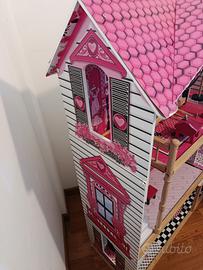 Bellissima casa delle bambole in legno adatta alla dimensione delle Barbie completa di mobilio all' interno. Regalo anche altri accessori Barbie. In vendita su Amazon a 169.00€!in qualche punto il colore è venuto via leggermente come mostro in foto