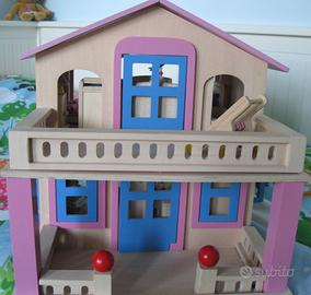 Magnifica casa in legno a due piani, con le sue finestre, porte laccate ed il mobilio offre uno spazio accogliente alle bambole pieghevoli.