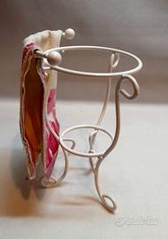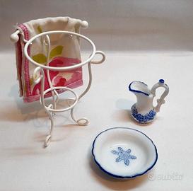 Delizioso lavabo in miniatura per Casa delle Bambole formato da 4 pezzi: Bacile (o Catino) e Brocca in porcellana con stampa floreale blu, struttura in metallo verniciato bianco e asciugamano in stoffa.