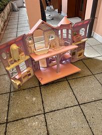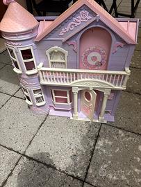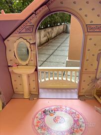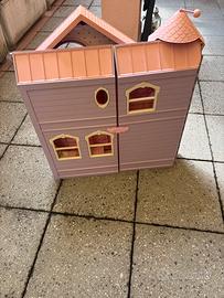 Casa Barbie originale anni 2000 in condizioni molto buone chiusa occupa poco spazio ( 20 cm di spessore)completa di accessori interni (divano, vasca, letto, culla..) ascensore e campanello funzionanti senza rotture a parte il cartoncino interno, che ho fotografato ,e una leggera usura degli adesivi.