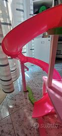 La casa è dotata di vari ambienti arredati all’interno, come una camera da letto, salotto, e una zona esterna con una palma finta e una lunga scivola rosa a spirale che parte dal piano superiore e termina a terra.