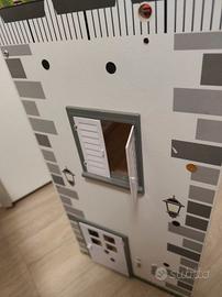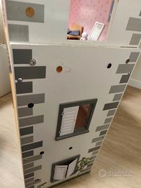 Vendo casa delle bambole in legno come da foto. misure 60(larghezza), 80 (altezza), 26 (profondità). Cordino dell'ascensore rotto ma può essere sostituito, una finestra rotta.