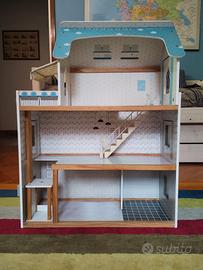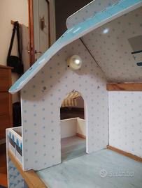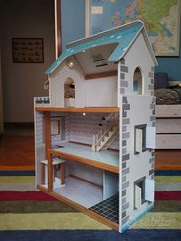 Casa di bambole con finestre apribili, ascensore e luci che si accendono, in buone condizioni. il gatto non è incluso!