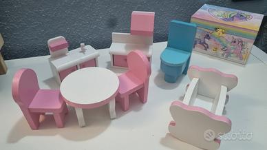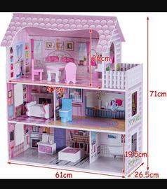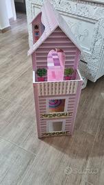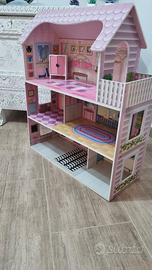 Vendo bellissima casa delle bambole a tre piani, realizzata in legno/resina color rosa e bianco, completa di mobili e decorazioni interne.
