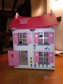 Bellissima casa per bambole in legno smaltato, completa di arredi e personaggi. Qualche segno di usura. Misura 55x30x38