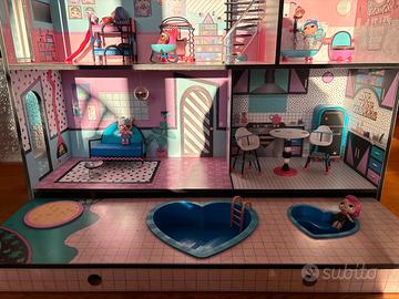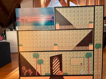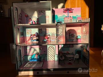 Salotto con tavolino, divano e palla da discoteca. Camefa da letto con due letti a castello separabili, appendiabiti e culla.
