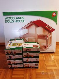 Casa di bambole di legno con arredi e pupazzi