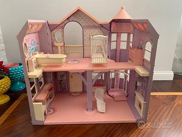 Bellissima casa di Barbie anni 2000 in ottime condizioni con arredi originali.la casa è un pezzo raro prodotto da mattel Che permette di restare chiusa occupando uno spessore di 20 cm e poi aprirsi con un sistema speciale che fa scendere i pavimenti creando una bellissima e grande casa a due piani.la casa è pulita, con arredi e adesivi in ottimo stato.nella torre l’ascensore funziona e attraverso una manovella sale e scende.
