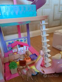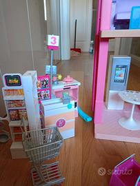 Casa di barbie come da foto. Comprata nuova, co.prensiva di accessori. Volendo c'è anche la vespa dibarbie, il market e varie bambole. E90. Con vespa, market e nbambole E140.