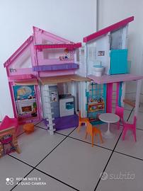 Vendo casa di Barbie a due piani in ottime condizioni. La casa si apre completamente e include diverse stanze: soggiorno con caminetto, cucina con elettrodomestici, camera da letto, bagno con WC e doccia. Presenti anche vari accessori originali: tavolino, sedie, divanetto, mensole e piccoli dettagli decorativi.