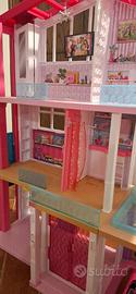 Casa di Barbie completa di scivolo ed accessori non esposti ma presenti( letto, divano, mobile sala basso, camino,cucinino, frigo, tavolo, 5 sedie, water, spazzolini e bicchieri bagno, macchina di Barbie