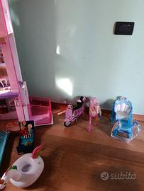 Casa di Barbie super accessoriata, con mobili aggiunti nel tempo più le Barbie con vestiti e accessori, più motorino, bicicletta, cavallo e carrozza. Tenuta in perfette condizioni. Tutto a 150€. Solo la casa ne costa 260.