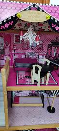 Casa di barby, alta 122 cm, larga 82 cm, completa di arredamento, con ascensore funzionante a mano. Tenuta in eccellenti condizioni (come nuova)