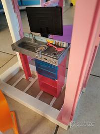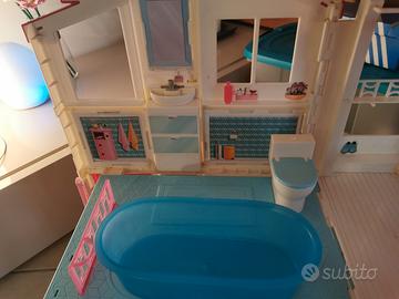 Casa di Malibú di Barbie su due piani, composta da cucina, salotto, camera da letto e bagno. Ascensore funzionante. Tetto apribile con ombrellone e due sdraio. Richiudibile. Completa di accessori. Praticamente nuova.