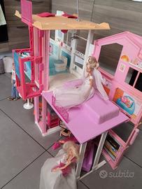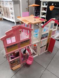 Casa di Barbie usata 3 volte (mia figlia mai ha giocato con bambole), 4 Barbie, vestiti fatti a mano. Regalo camper e scooter usati.