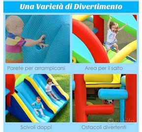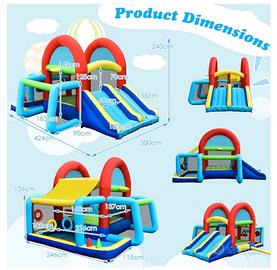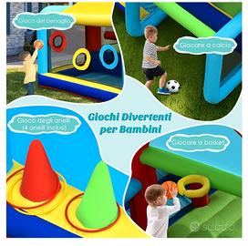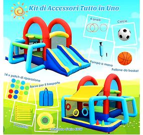 Il castello gonfiabile,tenuto sempre al chiuso, in ottime condizioni, con compressore,permette loro di saltare, scivolare, arrampicarsi, tirare a canestro, calciare la palla e lanciare gli anelli, così si divertiranno con gli amici. Inoltre, ci sono alcuni ostacoli divertenti tra la piscina con palline e la casa gonfiabile che rendono il tutto molto interessante. L’area per giocare è circondata dalla rete di protezione ed è coperta dal tettuccio, così i bambini non staranno sotto il sole cocente. Questa casa è sicura e divertente da usare e i bambini avranno ricordi meravigliosi della loro infanzia. Il materiale di alta qualità prolunga il divertimento e la durata del prodotto. Centro attività tutto in uno:questa casa gonfiabile è un centro attività formato da un’area per saltare, doppi scivoli, una porta di calcio, un anello da basket, una parete per arrampicarsi, una piscina con palline, un gioco di bersaglio e di lancio degli anelli. Allontana i bambini dagli schermi e permette loro di rimanere in salute. Divertimento per bambini e amici:la parte gonfiabile del castello può contenere 3-4 bambini fino a 120 kg. Si divertiranno tantissimo nelle feste di compleanno. I palloni gonfiabili da basket e da calcio sono inclusi per poter allenarsi a calciare e a tirare a canestro. La confezione include: 1 x castello gonfiabile 1 x borsa di trasporto 4 x anelli 7 x paletti 14 x patch di riparazione 1 x pompa manuale per i palloni 1 x pallone gonfiabile da basket 1 x pallone gonfiabile da calcio 1 x compressore 450 W