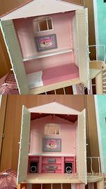 Casa giocattolo per le bambole/barbie a 3 piani, mancanti un letto e un divano, con pochissimi difetti di usura sulla plastica, usata poche volte, in regalo gli asccessori per la cucina.