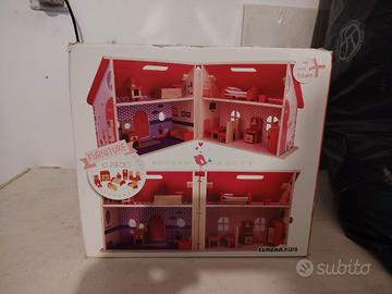 Casa delle bambole in legno marca Eureka Kids, richiudibile e trasportabile, completa di mobili e personaggi.