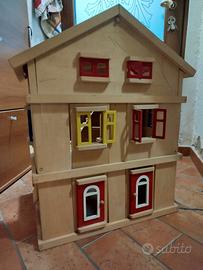casa per bambole in legno mod. goki. completa di finestre facilmente removibili per posizionare bamboline e mobili all' interno. Condizioni buone, è da ripulire da alcuni segni di matita. Allego in omaggio kit di piccoli mobili in balsa da assemblare. Solo ritiro a domicilio.