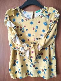Casacca a fiori gialla per bambina. Fantasia floreale con fiori blu e bordeaux. Maniche corte a volant. Scollo rotondo con apertura a goccia sul retro. Tg 140cm, usata solo 2 volte, in ottimo stato.
