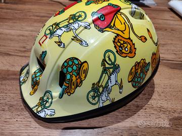 vendo caschetto bici giallo con stampe di animaletti, fascetta con protezione del mento. ben tenuto.