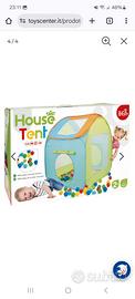 Casetta per bambini con palline colorate. La casetta è smontata e appiattita occupa poco spazio. Le palline sono contenute in una comoda custodia di stoffa, con manico per il trasporto