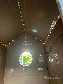 Vendo casetta bambini realizzata totalmente in cartone Finestre e porta che si aprono e chiudono, finestre con dei ganci per poterle chiudere come fossero dei balconi. Luci interne e campanello. Rivestita con carta da parati bianca e verde Prezzo 30€