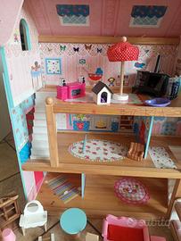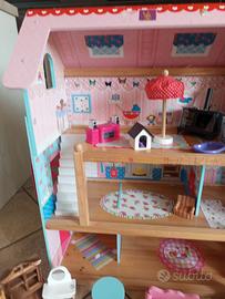 Casetta bambole usata poco. Compresi mobili suoi e altri comprati a parte. Misure 50*20*60