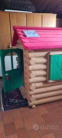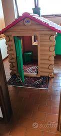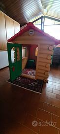 Ampio chalet con interno spazioso e completo di ogni dettaglio: finestre con persiane apribili; porta con chiavistello; caminetto che si trasforma in tavolino all'aperto; panche che scorrono attraverso la parete per essere utilizzate sia fuori che dentro casa; comignolo staccabile da utilizzare anche come seggiolino.