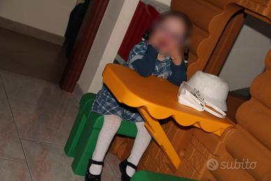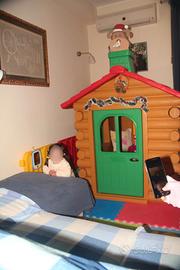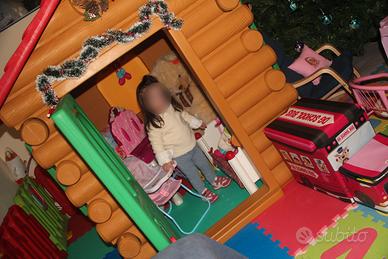 Casetta per bambini da esterno come nuova, sempre utilizzata dentro casa, come si vede dalle foto, marca Chicco, modello Chalet, con porta e finistre, tavolino apribile sul retro della casetta con panche estraibili. Estramemente robusta e ben costruita, compresa di camino che all'occorrenza può diventare un como sgabello. Dimensioni: 116x130x142.