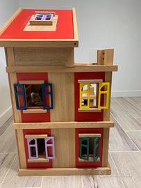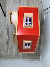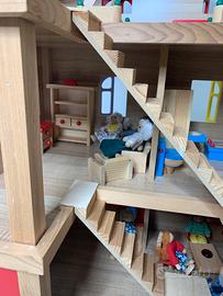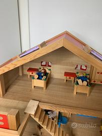 Casetta delle bambole immobiliata in legno con dei mobili in legno e personaggi (10 membri della famiglia) in legno.