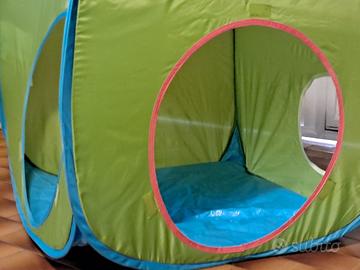 Struttura pieghevole con vari fori per gioco in casa di bambini fino a 6 anni. Con ingressi di varie misure e colori. Una volta piegata si riduce ad un cerchio del diametro di circa 40 cm. Materiale sintetico lavabile.