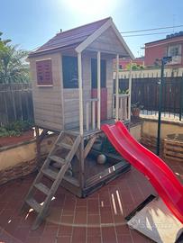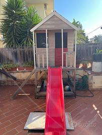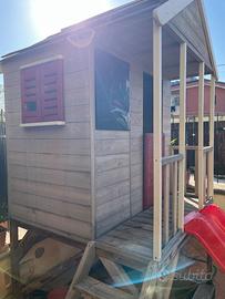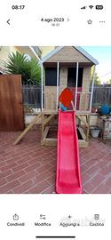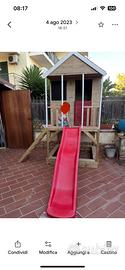 Vendo splendida casetta da giardino in legno massello, solida e resistente, perfetta per il gioco all’aperto. Struttura rialzata su palafitta con scala laterale e scivolo rosso frontale, per un divertimento completo e sicuro. Caratteristiche: * Struttura robusta in legno naturale * Tetto con finitura rossa * Verandina coperta con ringhiera * Scaletta di accesso stabile * Scivolo in plastica resistente * Spazio sottostante utilizzabile (es. sabbiera o area gioco) Condizioni: usata ma in ottimo stato, sempre tenuta all’esterno con cura. Ideale per giardino o terrazzo spazioso. Ritiro a carico dell’acquirente