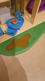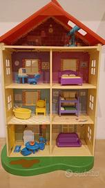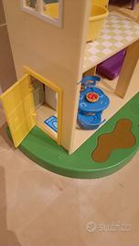 Casetta di Peppa Pig a più piani con cucina salotto due camere bagno studio e soffitta. Con personaggi. La porta si apre ..se Peppa salta sulla pozzanghera si sente la voce di Peppa che ride.. se si preme lo zerbino sì sente la voce di papà pig e si accendono le luci.