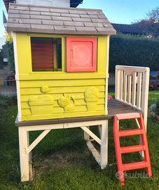 Casetta per bambini su palafitta, consigliata 2-6 anni, con 2 finestre con persiane scorrevoli, 1 finestra oblò, piccolo balcone con scivolo (con attacco acqua) e scaletta.