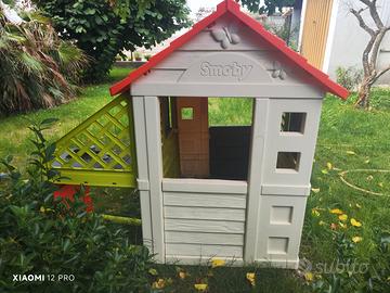 La casetta Smoby Pretty Nature è una casetta bella e spaziosa nella quale possono giocare comodamente più bambini, che si divertono insieme. È rifinita in splendidi colori tenui crema-rosso-verde, completati da un marrone-grigio pastello per evidenziare i dettagli interessanti. Al tatto, la plastica della casetta è vellutata e piacevole. Le doppie pareti della casetta garantiscono sicurezza, resistenza e stabilità. L'intera casetta ha dimensioni di 145*110*127 cm e accanto alla casetta c'è una cucina per i piccoli cuochi. La casetta è venduta nuova, ma senza gli accessori della cucina. Si trova a Villa Fastiggi, Pesaro.