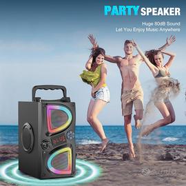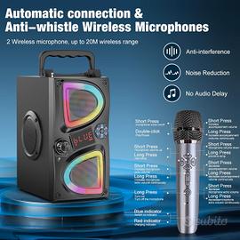 Karaoke per Bambini Adulti, Piccolo Cassa Karaoke Bluetooth Portatile con 2 Microfoni Wireless e Luci LED, Regali Giocattoli per Tutti gli Smartphone, Compleanno, Famiglia, Festa in Casa. karaoke è progettato con una maniglia per il trasporto, che consente di portare questo piccolo apparecchio all'aperto ovunque. La batteria ricaricabile assicura che possiate divertirvi senza freni anche all'aperto, e la capacità di 4000mah garantisce tre ore di festa non-stop. ✿【Spettacolo di luci da discoteca guidato dai beat】- Intorno alle unità di altoparlanti sono presenti due luci acustiche colorate, che cambiano colore e danzano al ritmo della musica; è inoltre possibile passare a una varietà di effetti luminosi per qualsiasi festa o raduno per creare un'atmosfera dinamica e fresca. Potete godervi lo spettacolo di luci mentre ascoltate la vostra musica preferita, regalandovi un'esperienza di karaoke indimenticabile. ✿【Un microfono in più, il doppio del divertimento】 - Il karaoke per uno è gratuito e divertente, quello per due è doppio. Include due microfoni wireless con una qualità audio chiara per amplificare perfettamente la voce. Si accoppieranno automaticamente con l'altoparlante quando li accenderete, pronti a suonare. Il diffusore dispone anche di un jack per microfono aggiuntivo che consente di collegare altri microfoni. ✿【Versatile e facile da usare.】 - Adotta il più recente chip Bluetooth 5.0 per lo streaming wireless, che garantisce una trasmissione più stabile e una distanza maggiore, assicurando una festa ininterrotta. Supporta anche le connessioni AUX, TF card e USB stick per i dispositivi senza capacità Bluetooth. È possibile scegliere la modalità di riproduzione preferita. Vendita tra privati garantita da Subito.lt. Restituzioni accettate solo se oggetto non corrisponde. Controllate e chiedete prima sulle caratteristiche.