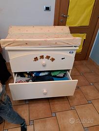 della Pali, 3 ampi cassetti in cui riporre vestitini, pannolini e tutto il necessario per la cura del vostro bambino/a, con decorazione di trenini color panna. Pienamente funzionale. Regalo il fasciatoio in gommapiuma, rivestito in plastica, facilmente lavabile che si poggia sulla parte superiore.
