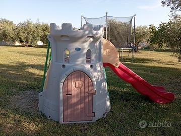 Bellissimo scivolo montato su una torre di castello. Consente molteplici possibilità di gioco contemporanee. Struttura molto stabile con uno scivolo di grandi dimensioni.