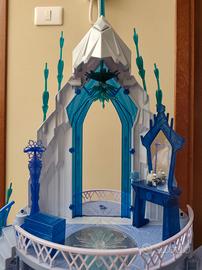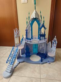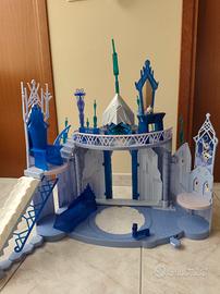 Castello magico di ghiaccio della fantastica storia Disney "Frozen". Completo di accessori (letto, poltrona, specchio, spazzola, supporto per fare ruotare le bambole e sgabello. Girando l'apposita manopola il castello si abbassa (guardare le foto) per ridurre l'ingombro oppure, spostando la leva e ruotando la manopola il piatto centrale ruota (consentendo di fare ruotare i personaggi e l'apposito supporto) e si accendono i led