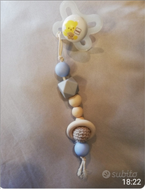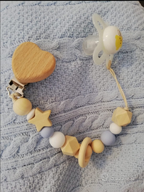 Catenella portaciuccio in legno e silicone I vostri bebè la adoreranno. Interamente personalizzabile nei colori e nei ciondoli.