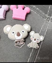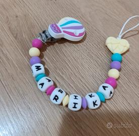 creo catenelle perspnalizzate con nome o senza ora ho disponibile gli acessori in foto ma a breve arrivano altri colori e modelli...sono realizzate con perline in silicone alimentare conformi alla legge e inferiori come lunghezza di 22 cm per la sicurezza del neonato senza sonstanze chimiche e BPA FREE